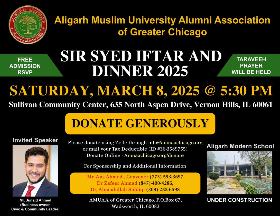 The Aligarh Muslim University Alumni Association of Greater Chicago (AMUAA-GC) cordially invites you to the Sir Syed Iftar and Dinner 2025, an evening dedicated to community, reflection, and togetherness.