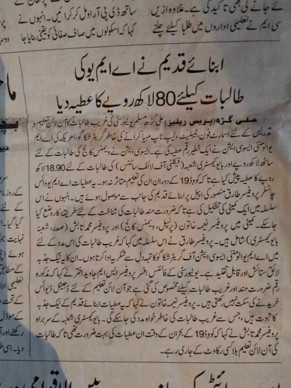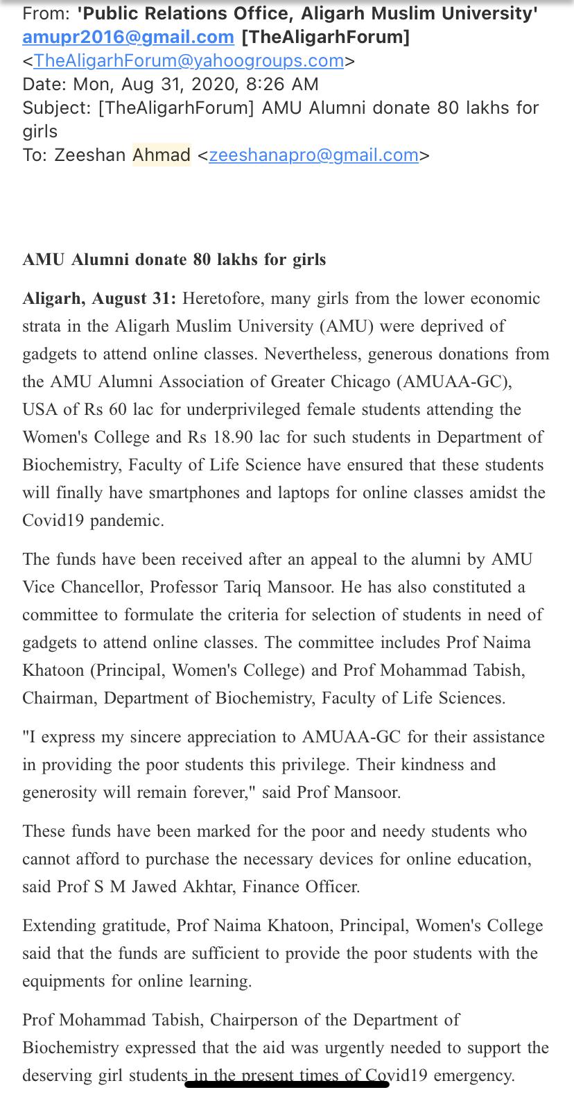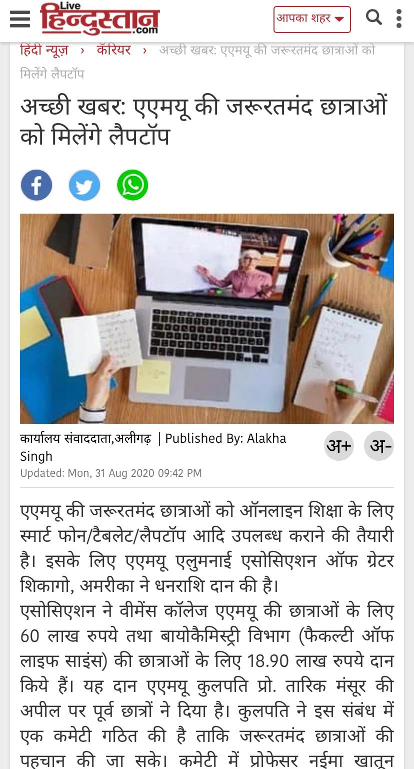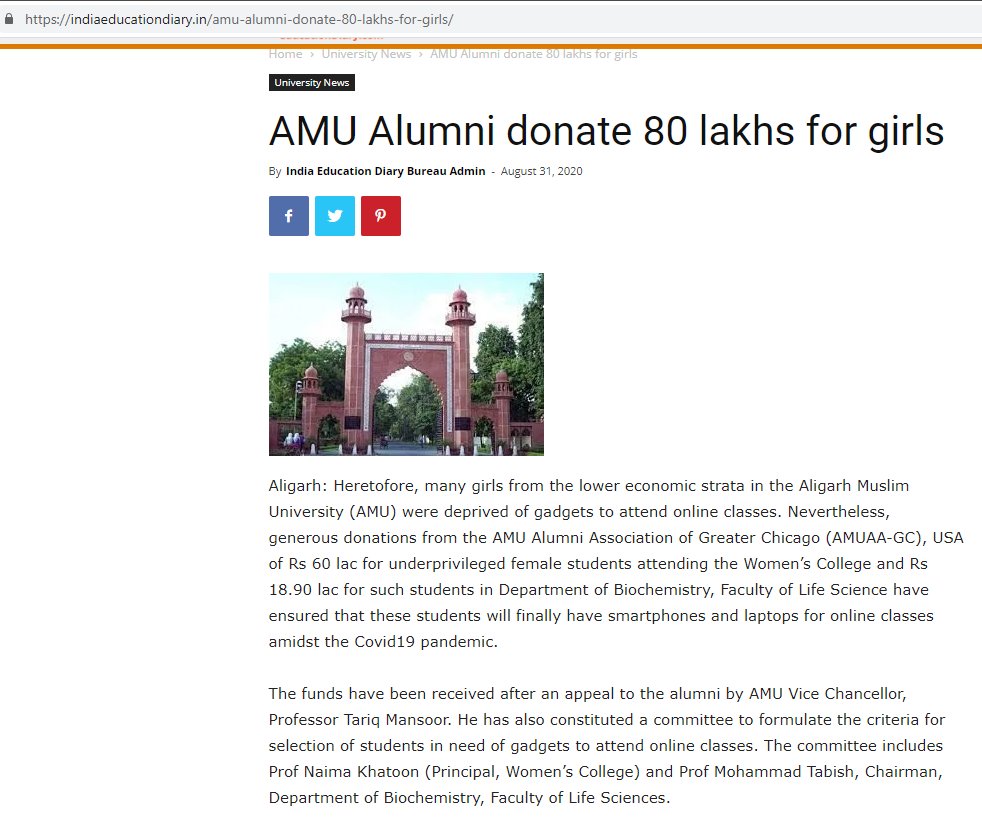 AMUAA-GC contributed INR 8,000,000 to support remote learning of underprivileged girls students hit by COVID to purchase laptops and smart devices in the times of pandemic, after an appeal to the alumni by AMU Vice Chancellor, Professor Tariq Mansoor. Thank you to all donors to make it possible. Our act is well covered in the India media and recognized by all sections.